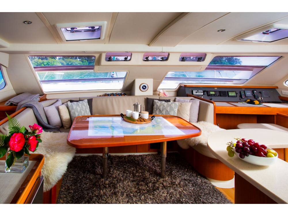 Te Harinui has four master queen cabins, each with their own ensuite bathroom, large indoor dining area and outside cockpit dining areas. There is ample room on the foredeck for relaxing. She has a well-equipped galley and the equipment on board is of a high standard. Toys are provided for your use and includes stand up paddle boards, fishing and snorkelling gear, dinghy and outboard.